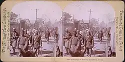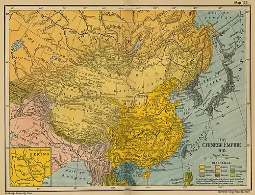 Endnu uheldigere gik det dog Kina 10 år senere, da det kom i krig med Japan. Dette havde allerede 1876 vundet indpas i Korea, uden at agte i mindste måde på Kinas formentlige overherredømme, og havde efterhånden formået dets regering til at åbne havnene for den europæiske handel (1882—1886) og erklære sig uafhængigt af Kina. Lidt efter lidt voksede Japans indflydelse i Korea, og da der 1894 udbrød en opstand her, sendte Japan lige så vel som Kina tropper for at dæmpe den. Da dette var sket, forlangte Kinas regering, at japanerne igen skulle trække sig tilbage; men tværtimod besatte de hovedstaden Soul og udvirkede en gentagelse af Koreas uafhængighedserklæring.[10] Dette førte snart til en krigserklæring fra Japans side 1. august 1894. Den japanske hær rykkede i oktober over Jalu-floden, og 22. november indtoges Port Arthur på sydspidsen af halvøen Liaotung. Også den øvrige del af denne halvø blev besat af japanske tropper, mens en anden hærafdeling rykkede frem mod Mukden. I februar 1895 indtoges endvidere havnestaden Wei-hai-wei syd for Petshili-bugten, og da den følgende tid bragte japanerne nye sejre både til lands og vands, var Kina nødt til at åbne fredsunderhandlinger, og 17. april undertegnede den kinesiske diplomat Li-Hung-Tsjang og Japans premiereminister Ito Hirobumi freden i Shimonoseki. Heri godkendtes Koreas uafhængighed, og til Japan afstodes Formosa, Pescadores-øerne og halvøen Liaotung, hvorhos der udrededes en meget stor sum i krigsomkostninger. Ved forenet indskriden af Rusland, Frankrig og Tyskland nødtes Japan til at give afkald på den sidstnævnte landudvidelse, men det blev i virkeligheden ikke Kina selv, som fik nogen gavn af denne indrømmelse.[11]