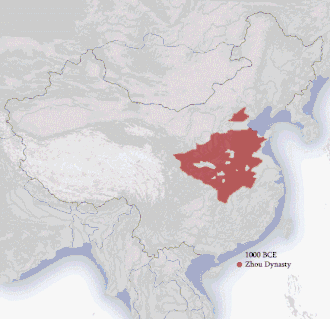 Af huset Zhou (1122-249 eller 1050-249) udmærkede sig især dets stifter, Wu-Wang, der af alle historieskrivere lige fra Konfutse prises som den forbilledlige hersker i enhver henseende.[1] I Ju-Wangs regeringstid (781—771) indtraf en solformørkelse, beregnet til den 29. august 776, den første sikre historiske dato i Kinas oldtid. Tshou-Tidens Kina omfattede endnu kun egnene om Huang Ho (Den Gule Flod); først fra 6.-3. århundrede udbredte kineserne sig over hele Yangtze-deltaet. Kejserhuset herskede direkte kun over dets egen landsdel, Tshou.[1] Som middelalderens Europa var Kina opløst i en række, nærmest uafhængige, lensstater, og de ulige kejserhuses navne er blot navnene på småstater, hvis fyrster tilrev sig overherredømmet, fx Tshou, Tsin, Han. Mellem de mange småfyrster førtes evindelige krige, retten sad i spydstagen, kejserhuset var ude af stand til at opretholde ro og orden. Tillige plagedes riget ved de hyppige indfald af tatarerne vest fra, Tu-kiue (tyrker), Hiung-nu (hunner), Sien-pi og andre centralasiatiske folk af ural-altaisk æt. Ved et angreb af hunnernes rytterskarer dræbtes Ju-wang, og hans søn Pin-wang (770—720) forlagde hovedstaden øst på til Lo-jang ved det nuværende Honanfu.[1] Vasalfyrsten i staten Tsin overtog sin lensherres forladte plads og optog kampen mod barbarerne. Efter hovedstadens flytning kaldtes den følgende tidsalder Dong-Zhou (oversat: de østlige Zhou), og Kinas historie opløses fra nu i en række beretninger og årbøger for de enkelte lensstater. De urolige forhold belyses bedst ved årbøgerne fra fyrstendømmet Lu for tiden 722—481. Denne yderst magre krønike, Tsjun-tsju, er det første historiske værk, hvilende på samtidige optegnelser. Den tillægges almindeligvis Konfutse.[1] Det sidste afsnit af Zhhou-dynastiets tid kaldes ikke med urette »de krigende staters tid« (ca. 475—249 f. Kr.). De mægtigste vasalfyrster tog kongetitlen (wang), således fyrsten af Tshu ved Jangtse, Tsi i Shantung og Tsin ude mod vest i Kansu og Shensi. Tsin opslugte efterhånden en række af småstaterne, og 249 f. Kr. afsatte dets konge den sidste skyggekonge af huset Zhou. De stridende småstaters tid var alligevel det kinesiske åndslivs blomstringstid.[1] I denne tidsalder, der også så Sokrates' og Buddhas fremtræden, udtaltes de tanker og tænktes den filosofi, der skulle præge kinesisk væsen og tankesæt for århundreder, og som endnu i sine virkninger behersker kinesisk samfundsliv i dets mindste enkeltheder. I dette tidsrum levede Kinas tre store tænkere, Lao-tse (f. 604), fornuftslærens grundlægger, Konfutse (551—479), der især lagde vægt på sædelæren, og Meng-tse (372—289).