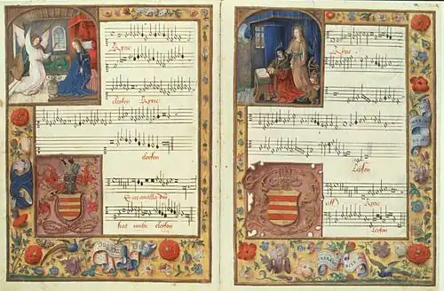 Middelaldermusik dækker den vesterlandske europæiske musik i tiden efter det Vestromerske riges fald i år 476 og frem til omkring år 1400. Den dominerende form var enstemmig sang, også kendt som gregoriansk sang eller plainsang, frem til omkring år 1100.[54] Kristne munke udviklede de første systemer for musiknotation i Europa med det formål at ensrette liturgien i hele Kirken.[55][56] Flerstemmig musik (musik med flere samtidige stemmer) udviklede sig gradvist fra den enstemmige sang i den sene middelalder og videre ind i renæssancen, hvor særligt de mere komplekse vokale værker som moteter kom til. I den tidlige middelalder var den vokale musik, særligt inden for den liturgiske genre, næsten udelukkende enstemmig, og bestod af en enkelt, uledsaget melodilinje.[57] Flerstemmige vokale former, hvor flere uafhængige melodilinjer blev sunget samtidig, begyndte at tage form i den højmiddelalderlige periode og blev udbredt i slutningen af 1200-tallet og begyndelsen af 1300-tallet. Blandt de mest markante komponister fra middelalderen kan nævnes Hildegard af Bingen, Léonin, Pérotin, Philippe de Vitry, Guillaume de Machaut, Francesco Landini og Johannes Ciconia.