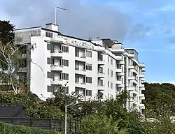 Bygningen er opført i seks etager i jernbeton og har fladt tag. Mod Aarhus Bugten er altaner buede, men mod Skovvejen og mod gården er rektangulære.
