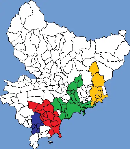 ![]() Kommuner og interkommunale enheder i Alpes-Maritimes : Blå : Communauté d'agglomération Pôle Azur Provence : (PAP) | ||