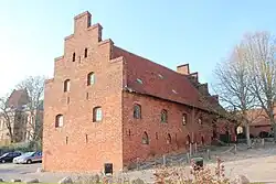 Ved den nordlige gavl er opført et bindingsværkshus.[4]