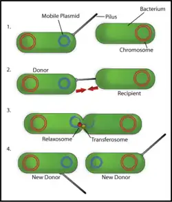 Konjugation foregår ved, at en bakterie etablerer kontakt til en anden bakterie ved hjælp af en såkaldt pilus. Dette kræver, at donorbakterien er udstyret med et plasmid med gener, der koder for en sådan pilus. Spidsen af pilus fra donorcellen danner bro til modtagercellen og holder de to celler sammen, således at DNA-overførslen kan foregå. Det er sandsynligt, at overførslen sker direkte igennem pilus, men der er også mulighed for, at pilus blot sørger for at donor og modtager forbindes.