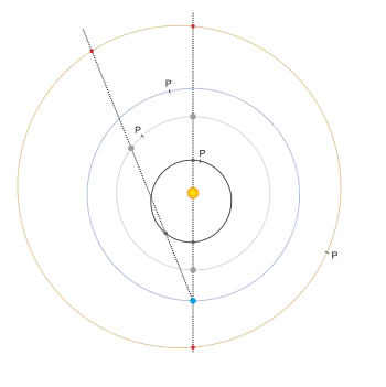 Når en ydre planet er på den anden side af Solen er den i konjunktion. Tiden mellem to konjunktioner er den samme som planetens synodiske omløbstid. Tabellen viser værdier for de ydre planeter.