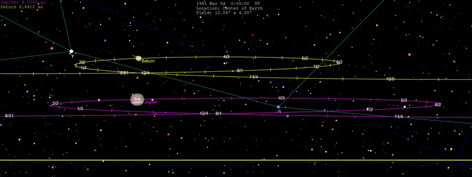 I 1980-81 indtraf en stor konjunktion, oven i købet en tredobbelt af slagsen bevirket af planeternes bevægelse i deres oppositionssløjfer, se figuren. De tre konjunktioner indtraf 31. december 1980 samt 4. marts og 24. juli 1981.[5]