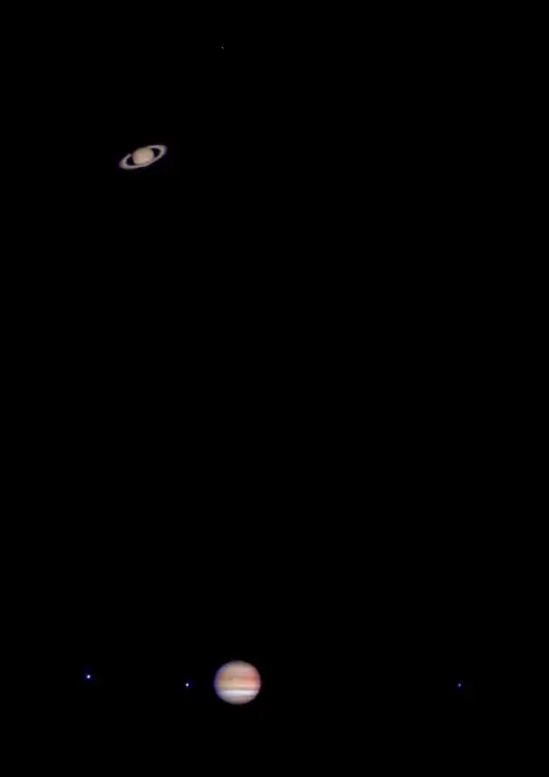 Den 21. december 2020 indtraf en konjunktion, der var bemærkelsesværdig ved den meget ringe mindsteafstand mellem planeterne, kun 6 bueminutter, svarende til 1/5 af Månens vinkeldiameter. I kikkert kunne planeterne og deres månesystemer ses i samme felt.