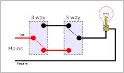 Ved C-korrespondance skifter hver omskifter mellem fase og nul. Når begge sider af pæren er forbundet til fase, er pæren slukket, samtidig med, at der er farlig spænding på pæren.