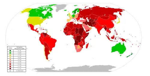 Organisationen Transparency International måler hvert år korruptionen i de fleste lande i verden. Blandt de mindst korrupte lande er OECD-landene og helt i top lande som Danmark (øverst), Finland og New Zealand, mens de mest korrupte lande oftest tæller lande i Afrika og Asien som Zimbabwe, Cambodia og Angola.