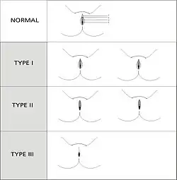 - Type I – også kaldet sunna eller clitoridotomi – betegner fjernelse af forhud omkring klitoris med eller uden samtidig fjernelse af en del eller hele klitoris.[4]
