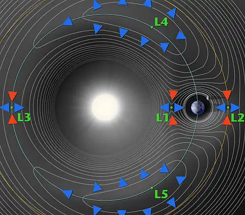 - Fra L2 væk fra planeten vil det gå i et selvstændigt kredsløb om solen med uret set fra planeten (som en ydre planet).
