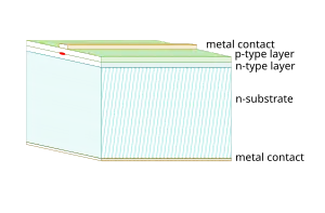 Som alle halvlederdioder består laserdioden[1] af en pn-overgang i et halvledermateriale, dog sjældent silicium. Når der sendes strøm igennem en diode i lederetningen, trænger nogle af de "overskydende" elektroner fra n-området ind i p-området, og huller ("ledige pladser" hvor der "mangler" en elektron) fra p-området trænger ind i n-området. Normalt vil elektronerne hurtigt finde et hul, og når de "falder i", frigives en smule energi i form af en foton eller "lyspartikel" – det er dét der foregår i en lysdiode.