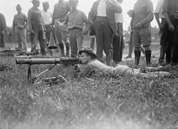 ![]() Et Lewis maskingevær med luftkølings kappe, tobenet og pandeformet magasin monteret for oven | |