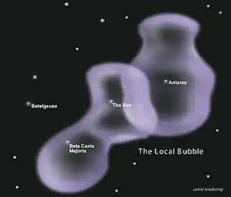 Den lokale boble er et "tomt område" i det interstellare rum i Mælkevejens Orion-arm. Området er mindst 300 lysår i tværsnit og har en tæthed af neutral brint, som kun udgør en tiendel i forhold til de 0,5 atomer per kubikcentimeter, som er gennemsnittet for det interstellare rum i Mælkevejen som helhed. Den varme, diffuse gas i den lokale boble udsender røntgenstråler, og den meget sparsomme og varme gas i boblen er resultatet af en supernova, som eksploderede inden for de sidste to til fire millioner år.[1] Den mest sandsynlige kandidat til at være resten af denne supernova er "Geminga" ("Gemini gammastrålekilden"), der er en pulsar i stjernebilledet tvillingerne.