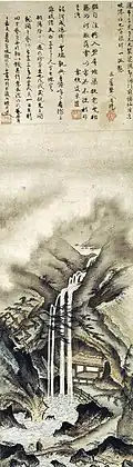 - ↑ "Malede kunstneriske arbejder i Tang-perioden var et resultat af idealiserede landskabelige omgivelser, med kun få genstande, personer eller aktivitet og var monokrome af natur..." ; (En.:) 'Painted artwork during the Tang period pertained the effects of an idealized landscape environment, with sparse amount of objects, persons, or activity, as well as monochromatic in nature ...'