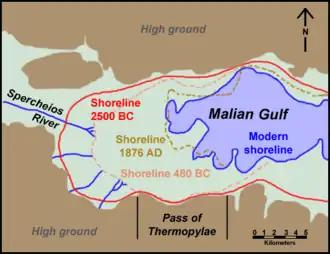 På grund af den konstante aflejring af silt fra floden Spercheios og mindre vandløb er bugten blevet mindre gennem århundrederne. I sommeren 426 f.Kr. ramte en tsunami kløften mellem den nordvestlige spids af Euboea og Lamia.[1] Det gamle Thermopylae-stræde, som på det tidspunkt, hvor Slaget ved Thermopylæ blev udkæmpet, blev afgrænset af bjerget Kallidromo og Maliabugten, er nu blevet en bred kystslette.