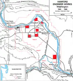 DuPont anbefalede at produktionsanlægget blev placeret langt væk fra uranproduktionsanlægget ved Oak Ridge.[92] I december 1942 sendte Groves oberst Franklin Matthias og ingeniører fra DuPont af sted for at undersøge mulige placeringer. Matthias rapporterede, at Hanford nær Richland, Washington var "ideelt på næsten alle punkter". Det lå isoleret og tæt på Columbia River, som kunne levere tilstrækkeligt vand til at køle reaktorerne, som skulle producere plutonium. Groves besøgte stedeti januar og grundlagde Hanford Engineer Works (HEW), med kodenavnet "Site W".[93]