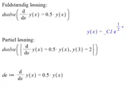 - Maple løser differentialligning med[21] denne kommando[22]: dsolve , (Dette er et eksempel. Se også illustration og tabel nedenfor).[23]
