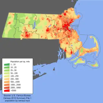 De fleste indbyggere bor i Stor-Boston, som omfatter det meste af det sydøstlige og centrale Massachusetts. Den vestlige del af staten har et mere landligt præg.