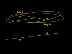 - ↑ Clemence, G. M. (oktober 1947). "The Relativity Effect in Planetary Motions". Reviews of Modern Physics. 19 (4): 361-364. doi:10.1103/RevModPhys.19.361.