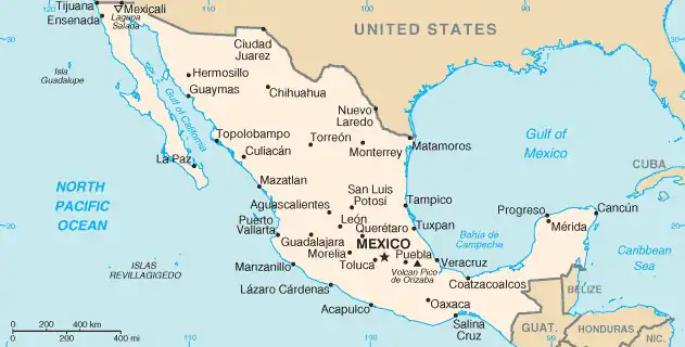 - 1 2 CIA. "Mexico" Arkiveret 29. januar 2018 hos Wayback Machine. The World Factbook. Hentet 23. december 2019.
