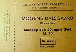 Den 20. april 1964 spillede den da 21-årige Mogens Dalsgaard sin officielle debutkoncert. Koncerten fandt sted i Musikkonservatoriets sal på H.C. Andersens Boulevard i København, og programmet bestod af værker komponeret af Johann Sebastian Bach, Johannes Brahms, Carl Nielsen, Claude Debussy og Franz Liszt.