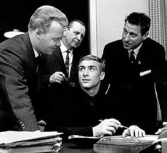 ![]() Bokseren Tom Bogs skriver professionel kontrakt med promotor Mogens Palle. Fra v. Mogens Palle, Børge de Wall, Tom Bogs og hans far Poul Bogs Larsen. | |