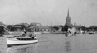 Et festklædt selskab står ud af Nakskov havn en dag formentlig mellem 1910 og 1914.