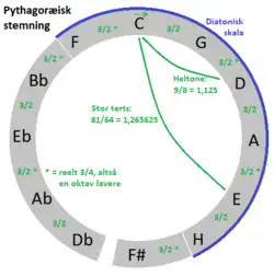 Den diatoniske skala er grundlaget i den vestlige verdens musik, og dens udgangspunkt var altså oprindeligt de naturlige rene intervaller oktav, kvint og kvart. Desuden er en heltone også et naturligt interval, nemlig intervallet fra den. 8. til den 9. naturtone med faktoren 9/8 = 1,125. I den pythagoræiske stemning kommer der således 5 steder en heltone. De to sidste steder, fra E til F og fra H til C, er der et interval med en faktor på 256/243 ≈ 1,05350, og dette interval kalder man en diatonisk halvtone (i den pythagoræiske stemning). De 5 mellemrum i heltonerne kan herefter videre fyldes ud med halvtoner, som enten bliver forsænkede toner (Bb, Eb, Ab, Db, Gb), hvis man går fra F og baglæns i kvintcirklen, eller hævede toner (F# ≈ Gb, C# ≈ Db, G# ≈ Ab, D# ≈ Eb, A# ≈ Bb), hvis man går fra H og forlæns i kvintcirklen. Her må vælge, hvilke af halvtonerne, man vil stemme "oppefra" (med b) eller "nedefra" (med #). Intervallet fra en heltone til dens forsænkede eller hævede halvtone kaldes en kromatisk halvtone (i den pythagoræiske stemning), og den har en faktor på 2187/2048 ≈ 1,06787. Halvtonerne mellem heltonerne vil altså komme til at ligge forskelligt afhængigt af, hvilken stemning man vælger.