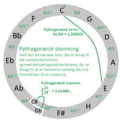 Den pythagoræiske stemning har også det problem, at den store terts er for stor. I følge den 5. naturtone skulle faktoren være 5/4 = 1,25 i stedet for 81/64 ≈ 1,2656, og tertsen vil lyde lidt falsk. Når man udelukkende stemmer vha. de rene intervaller, bliver det altså på bekostning af, at tertserne ikke stemmer. Denne forskel på (81/64) : (5/4) = 81/80 = 1,0125 kaldes et syntonisk komma, og den giver en hørlig urenhed.