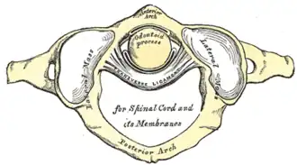 - Ligamentum transversum atlantis, som danner det kraftigste strøj fra lateraltsiderne af atlas' inderkant, henover dens axis for at holde den stramt imod fovea dentis.