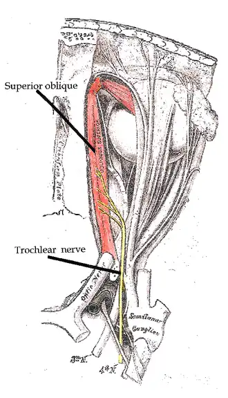 ![]() Nervus trochlearis' forløb, højre øje, superiort vue | |