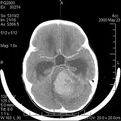 Computertomografi af hjernen viser typisk en vævsmasse, der kan forstærkes af begge kontraster. På CT forekommer lavgradige gliomer sædvanligvis isodense til det normale parenkym og viser derfor muligvis ikke kontrastforstærkning. På samme måde er læsioner i den bagerste kraniale fossa svære at identificere på CT. Følgelig er resultaterne af en sådan tomografi alene ikke altid tilstrækkelige til diagnostiske formål. I tvivlstilfælde er brugen af den mere følsomme magnetiske resonansbilleddannelse afgørende.
