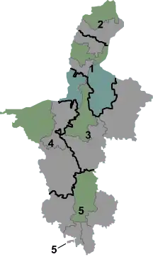 Disse 5 bypræfekturer er inddelt i 21 enheder på amtsniveau (8 distrikter, 2 byamter og 11 amter).