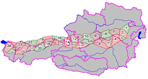 violette linjer viser grænserne mellem de østrigske delstater