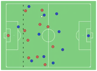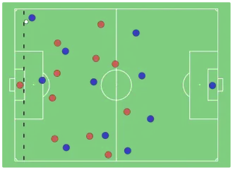 - en del af spillerens hoved, krop eller fødder er på modspillernes banehalvdel (midterlinjen tæller ikke med, da det medregnes som spillerens egen halvdel), og