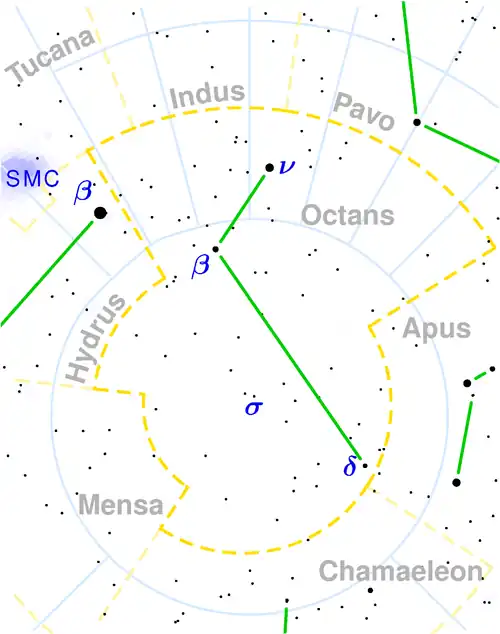 Himlens sydpol befinder sig i Oktanten, men der er ikke nogen klar stjerne til at markere den, som der er med himlens nordpol (Nordstjernen).