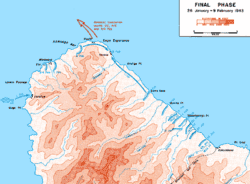 - ↑ Frank, p. 589–590, Jersey, p. 378–380, 383, 400–401, Miller p. 342–343, 346. Japanerne kendte den nogenlunde størrelse af Georges styrke efter at have forhørt to amerikanske soldater, som var blevet taget til fange ved en skudveksling nær Titi på sydkysten. Efter forhøret blev de to amerikanere uden videre henrettet. Yanobataljonen, som efter tab i kamp var nede på 350 mand, blev bistået af omkring 60 mand fra 124. og 28. infanteriregiment. Den 3. februar mistede japanerne fem G4M bombefly under et fejlslagent angreb på Halseys flåde, herunder et med orlogskaptajn Genichi Mihara, chefen for 705. luftgruppe. Det amerikanske 161. regiment var på dette tidspunkt under kommando af oberst James Dalton II (Miller, p. 346).