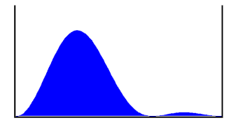 Sandsynlighedsfordelingen for de tre laveste energiniveauer. Alle fordelingerne er symmetriske, men der er både områder med høj sandsynlighed (toppene) for at finde partiklen, samt områder med lav sandsynlighed (dalene).