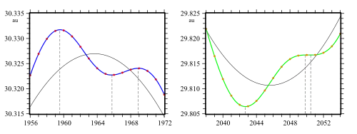 Planeten, hvis omløbstid om Solen er 164.8 år, var sidst i aphel den 13. juli 1959 i en afstand fra Solen på 30.33174 au. Herefter aftog afstanden, men nåede et minimum på 30.32272 au den 6. oktober 1965, hvorefter den igen voksede til et sekundært maximum på 30.32407 au den 21. november 1968, se figurens højre del. Herefter aftog afstanden frem til perihelpassagen, der indtræffer 5. september 2042 i en afstand på 29.80643 au. Den samme forløb som ved aphel gentages (marginalt) i årene 2049 - 2050 med et sekundært maximum (24. oktober 2049, 29.8167112 au) og et sekundært minimum (25. juni 2050, 28.8166696 au), se figurens venstre del.