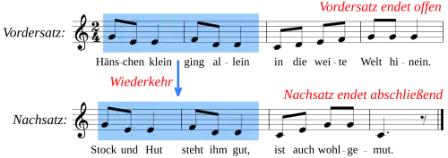 (Wiederkehr: gentagelse) - Forsætningen ender her åbent, på dominanten; eftersætningen afsluttende, på grundtonen