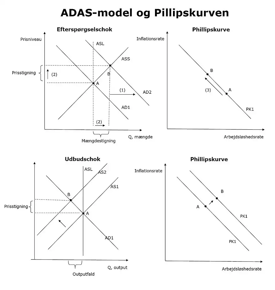 Stød til AS-kurven derimod påvirker, at selve Phillipskurven rykker sig, da trade-off’et mellem inflation og arbejdsløshed er blevet strukturelt anderledes. Her får vi altså cost push-inflation.