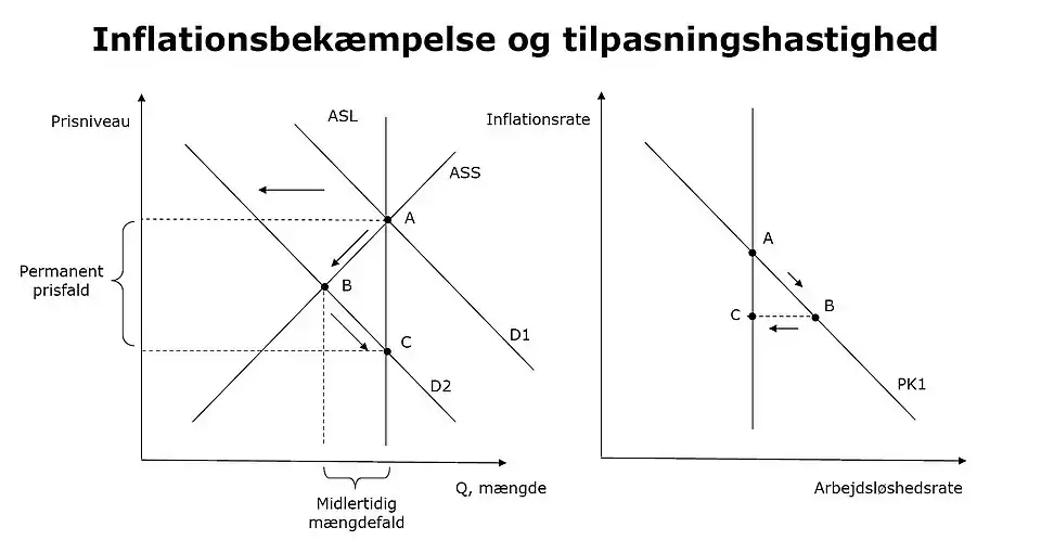 På lang sigt er aktuel inflation = forventet inflation, og på lang sigt er Phillipskurven altså lodret. Spørgsmålet har dog været, hvor hurtigt man kommer til det lange sigt. Især inden for inflationsbekæmpelse har dette spillet en rolle. I figuren nedenfor kan spørgsmålet stilles som, hvor hurtigt bevægelsen går fra A over B til C, når man laver det kontraktive indgreb (rykker AD-kurven mod venstre) gennem pengepolitikken. Nyklassiske teoretikere såsom Robert Lucas, Thomas Sargent og Robert Barro siger i teorien om rationelle forventninger, at denne tilpasning kan gå meget hurtigt, og i teorien være øjeblikkelig, hvis befolkningen på forhånd er overbevist om, at indgrebet kommer.