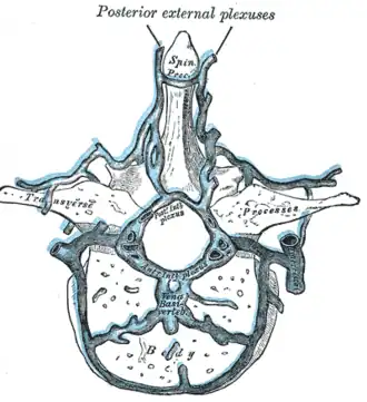 ![]() Venenetværket omkring en ryghvirvel set fra oven. Plexus venosus vertebralis internus omringer rygmarvens dura mater. | |