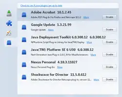 Liste over plug-ins i webbrowseren Mozilla Firefox.