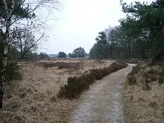 Typisk hedevegetation. I hjulsporene er førnen og det tynde humusholdige lag slidt væk, så blegsandet ses.