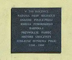 - ↑ Rudolf Benl, Die Gestaltung der Bodenrechtsverhältnisse in Pommern vom 12. bis zum 14. Jahrhundert, Böhlau, 1986, p.240, ISBN 3-412-01586-5: "Die deutsche Stadt Pölitz war 1260 von Barnim I. gegründet..."