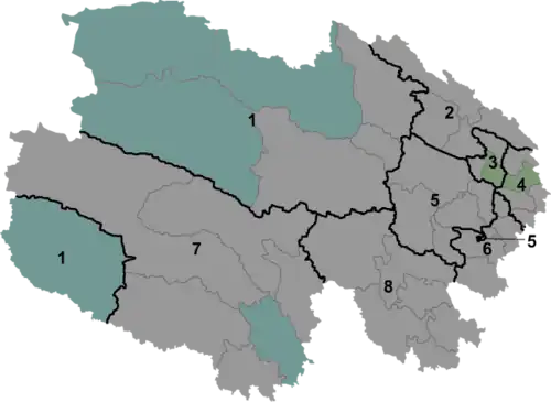 | 6 | Huangnan (For tibetanerne) | 黄南藏族自治州 | Huángnán Zàngzú Zìzhìzhōu | Tongren | Autonomt præfektur | |