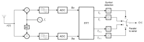 - blande det analoge signal med to signaler fra en oscillator med to udgange indbyrdes forskudt 90 grader, som vist i OFDM-modtager illustrationen. Det kaldes en QSD (Quadrature Sampling Detector), DDC (Digital Down Converter) eller Tayloe-detektor (opkaldt efter Dan Tayloe N7VE) - og de to blandere virker hver især stort set på samme måde som dioderingmikseren. Herefter sendes de to mikser-output signaler (Re, Im også kaldet I, Q) ind i hvert deres lavpasfilter.[7][8][9] Nu bringes de to signaler til digital form i hver deres AD-konverter (f.eks. i et PC lydkort). Kombinationen af signalerne I og Q – og intern signalbehandling gør at spejlfrekvensen dæmpes.
