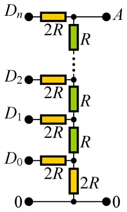 På diagrammet til højre er den elektriske modstand i de modstande, der er markeret med gul farve, dobbelt så stor som i dem med grøn farve. "Kilden" til de binære signaler, der skal konverteres, skal idéelt have en impedans på nul ohm, og skal præsentere det binære tal uden fortegn og med positiv logik, sådan at binært "0" svarer til 0 volt (i forhold til den fælles stelledning nederst i diagrammet), og "1" repræsenteres ved en konstant spænding forskellig fra 0 volt.
