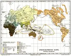 | Kaukaside: Arier Semitter Hamitter Negride: Negre Hottentott Melanesier Negrito Australider Usikker: Dravider & Singalesere | Mongolide: Nordmongoler Kinesere & Indokinesere Japanere & Koreanere Tibetaner Malajer Polynesier Maorier Mikronesier Eskimoer Indianere |